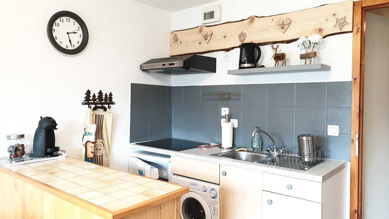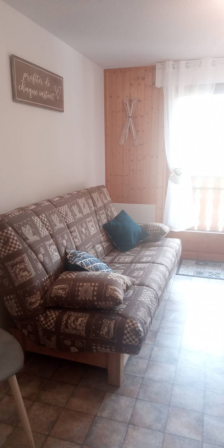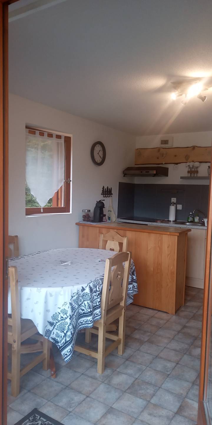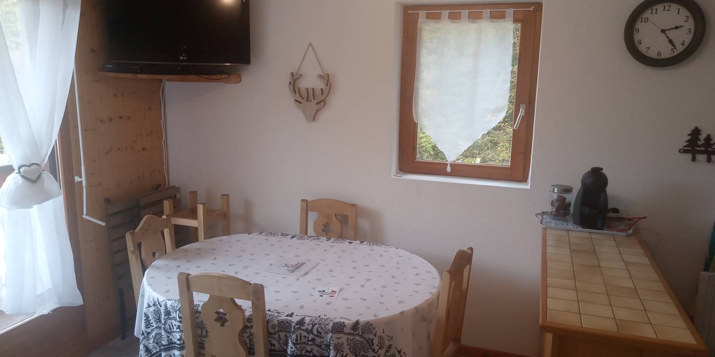 - un séjour avec coin repas : une table ronde avec rallonge en pin massif et 6 chaises (Lave linge défectueux - photo)- .Cet espace donne sur un balcon de 4m² exposé ouest offrant une vue sur les montagnes et la vallée