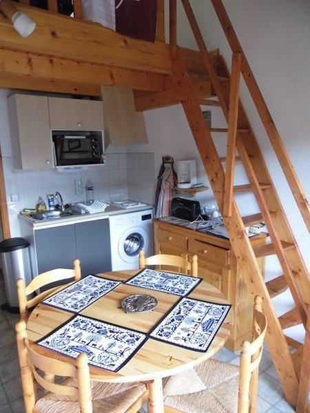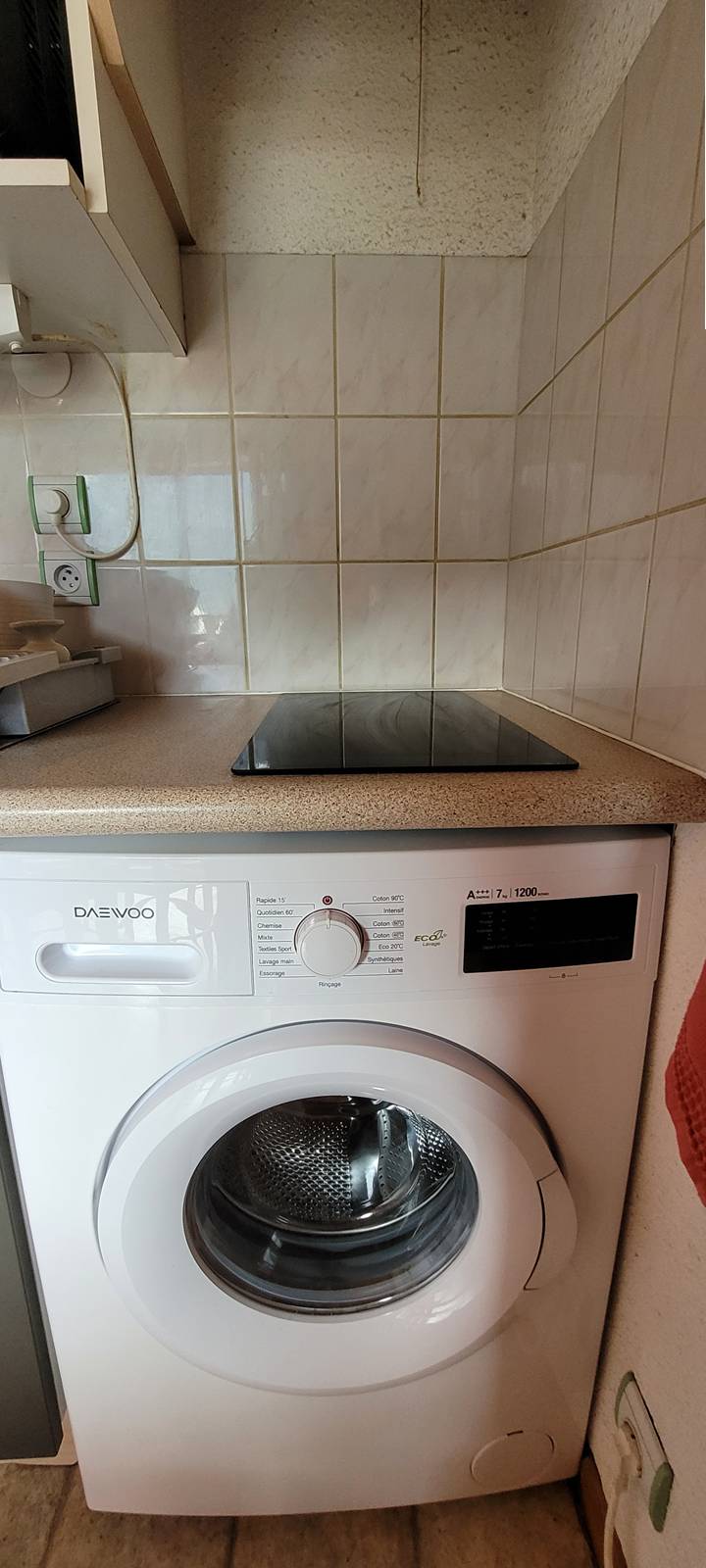 - une kitchenette équipée avec placards, 2 plaques de cuisson, réfrigérateur avec compartiment congélateur, machine à laver, mini four et micro-ondes
