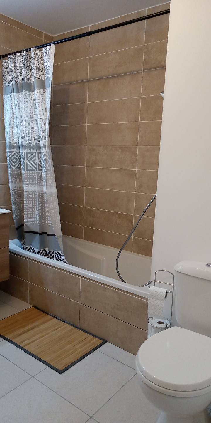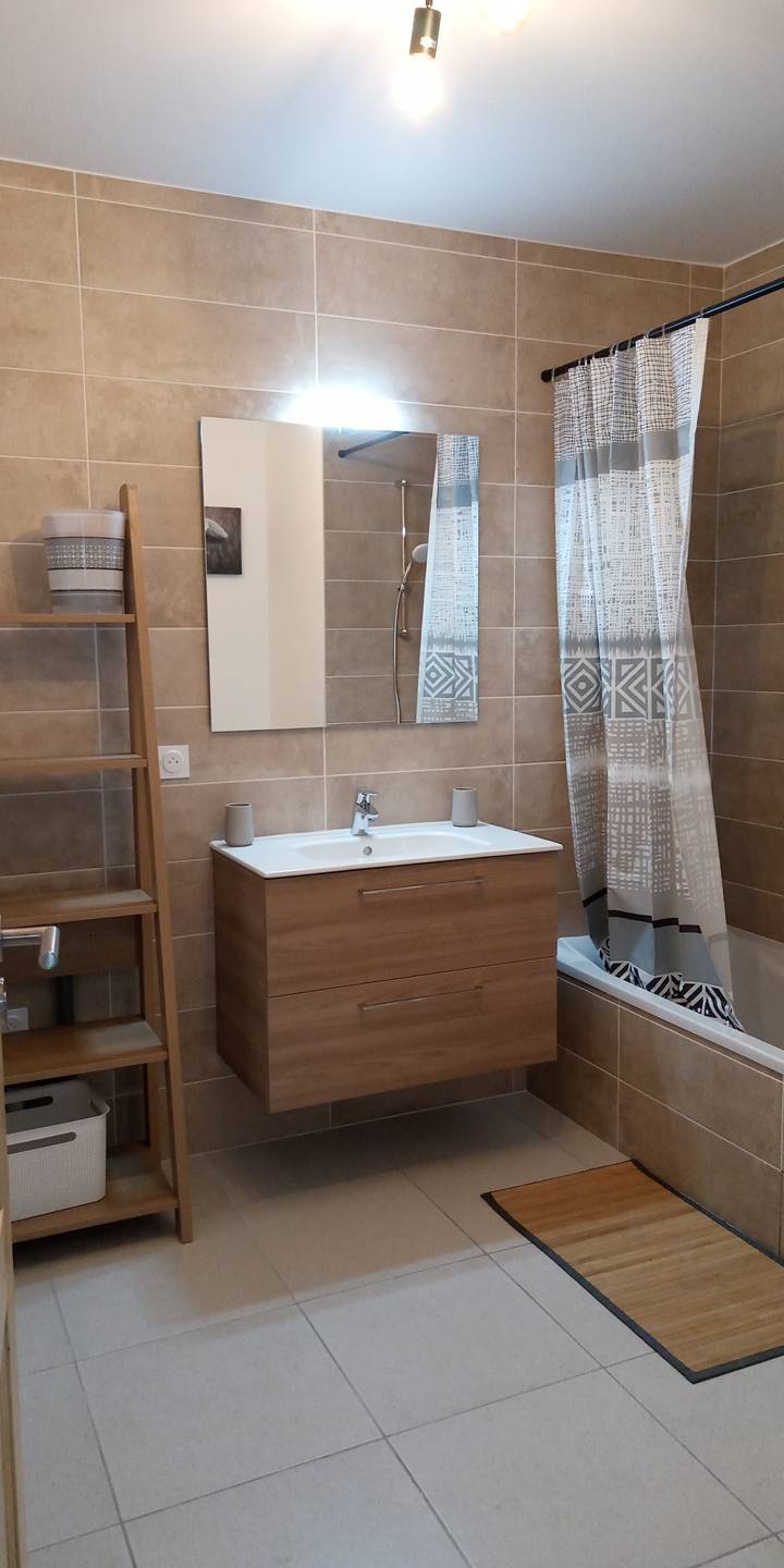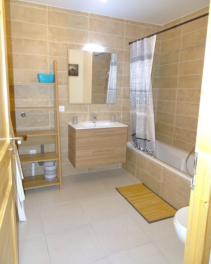 - une salle de bain (avec baignoire) moderne avec lavabo et wc