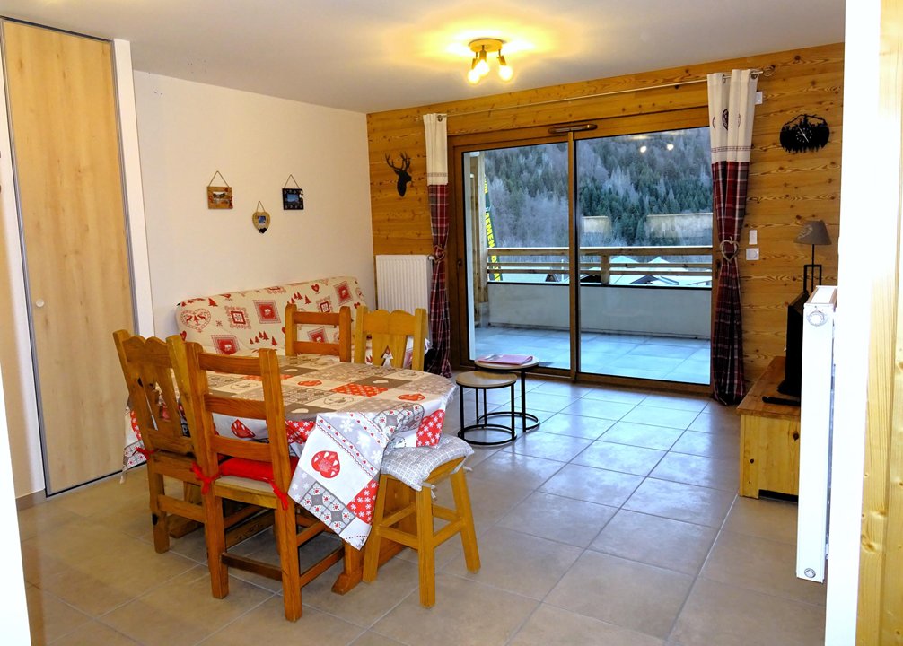 - un coin repas avec une table, 4 chaises, 2 tabourets. Cet espace donne sur un balcon terrasse de 16 m² offrant une vue dégagée sur la station et les montagnes.