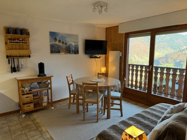 - un coin repas avec une table à rallonge, 6 chaises, un tabouret. Cet espace donne sur un balcon offrant une vue sur la vallée.
