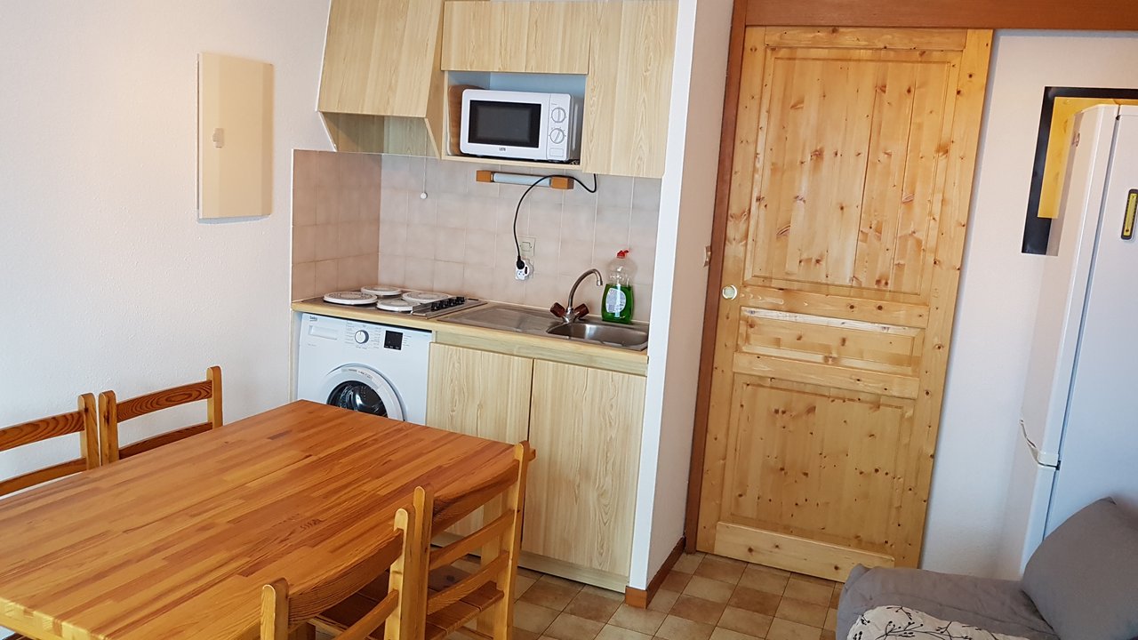 - une kitchenette équipée de 4 plaques de cuisson, réfrigérateur, micro ondes, lave-linge, bouilloire électrique, easygrill Tefal, un petit four électrique, rangements.