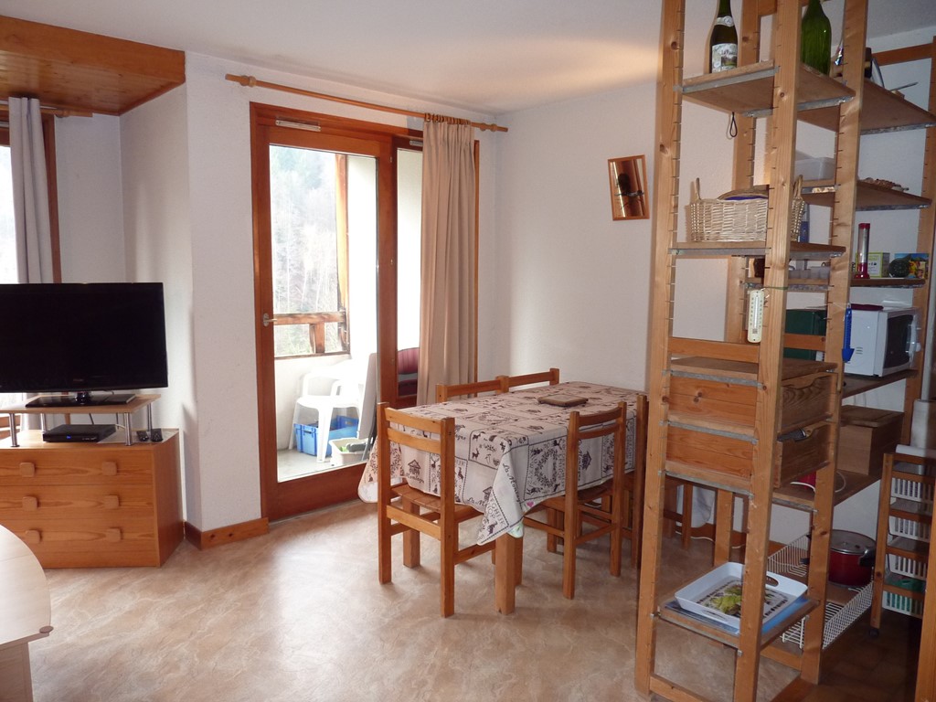 - un coin repas avec une table, 5 chaises et d'une étagère. Cet espace donne sur un balcon de 2 m² exposé ouest avec vue sur les montagnes