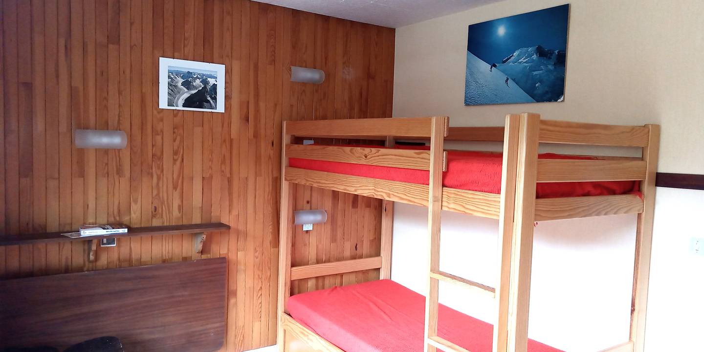 D’un hall d’entrée desservant la salle de bain (baignoire + lavabo) avec lave-linge, WC indépendant- a suivre la chambre avec 2 lits superposés une baie vitrée illumine cette pièce et donne accès au balcon.