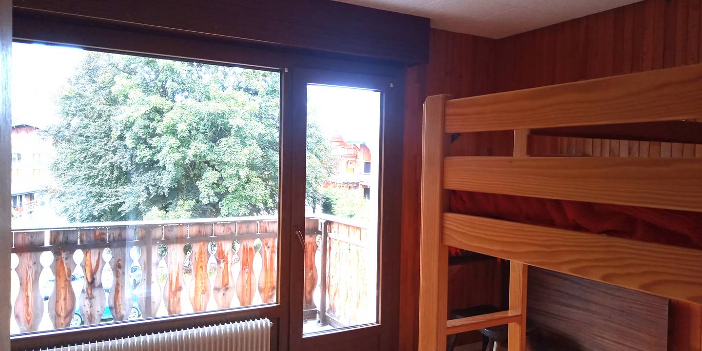 D’un hall d’entrée desservant la salle de bain (baignoire + lavabo) avec lave-linge, WC indépendant a suivre la chambre avec 2 lits superposés + 1 lit tiroir - une baie vitrée illumine cette pièce et donne accès au balcon.