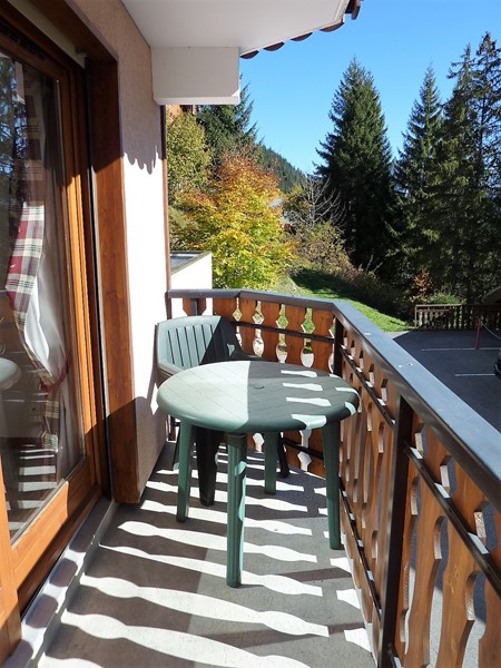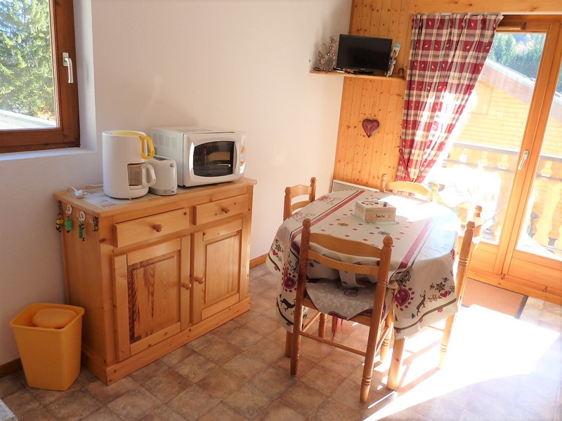 - un coin repas avec une table, 4 chaises et 2 tabourets. Cet espace donne sur un balcon de 3,32 m² exposé Sud-Est avec une échappée sur les montagnes