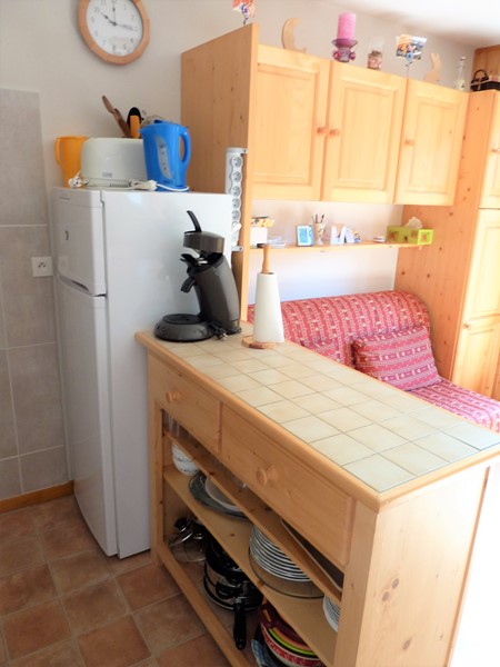- une kitchenette équipée : placards, grand réfrigérateur avec compartiment congélateur, combiné 4 plaques + four électrique, lave vaisselle, four à micro-ondes et lave linge