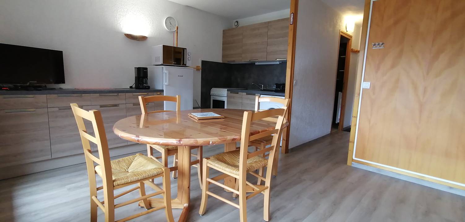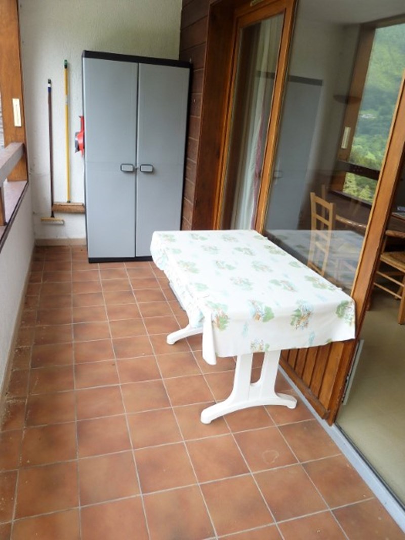 - un coin repas avec une table, 5 chaises et rangement. Cet espace donne sur un balcon de 4m² avec une belle vue dégagée sur la vallée. Fermeture par volet roulant électrique.