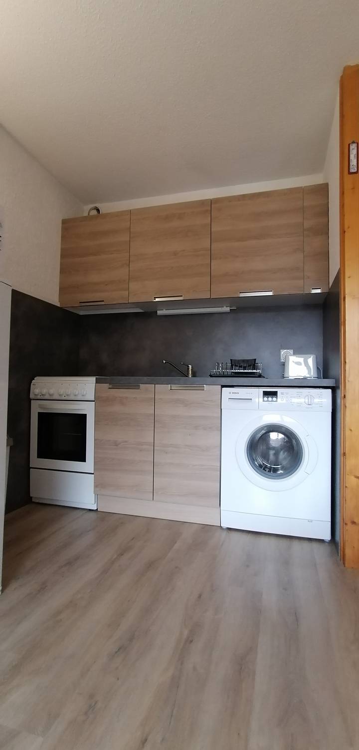 - une kitchenette équipée avec placards, machine à laver, cuisinière électrique 4 plaques, four, grand réfrigérateur et micro-ondes