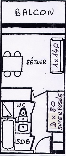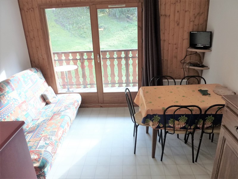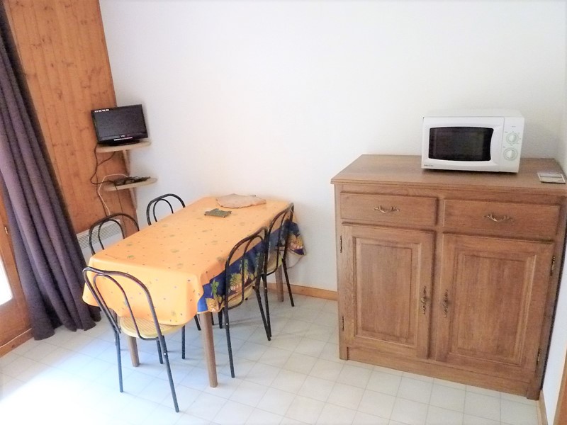 - un coin repas avec 1 table et 5 chaises. Cet espace donne sur un balcon exposé ouest, avec vue sur les pistes