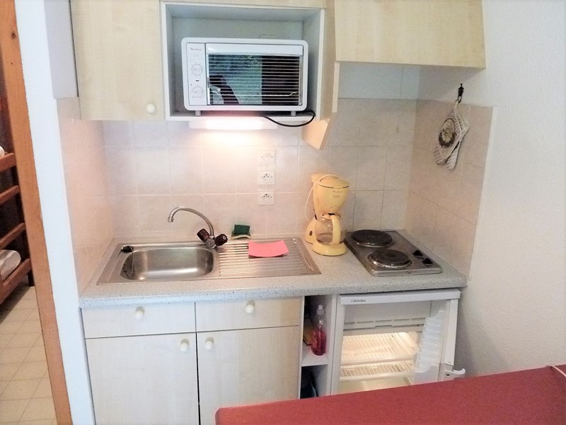 - une kitchenette équipée avec 2 plaques électriques, réfrigérateur table-top, mini four, micro-ondes et placards