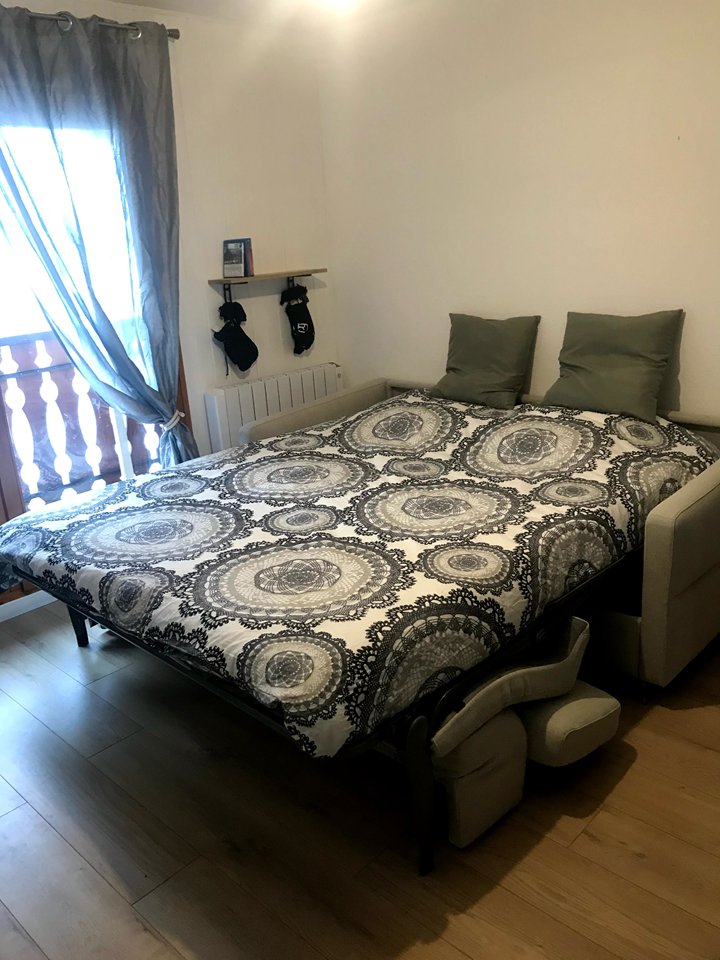 La pièce de vie et sa cuisine équipée: four, machine à café capsules (nespresso) vaisselle pour 4 personnes, plaque à induction, hotte, réfrigérateur, une table et 4 chaises, une télévision écran plat, un canapé lit convertible de 160x200, cette pièce donnez accès au balcon avec table et 4 chaises - un casier à ski, complète ce bien.