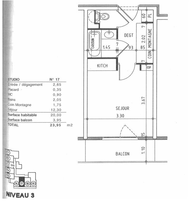 studio de 20 m² au 3ème étage (niveau de la passerelle) de la résidence le BOUQUETIN (avec ascenseur)