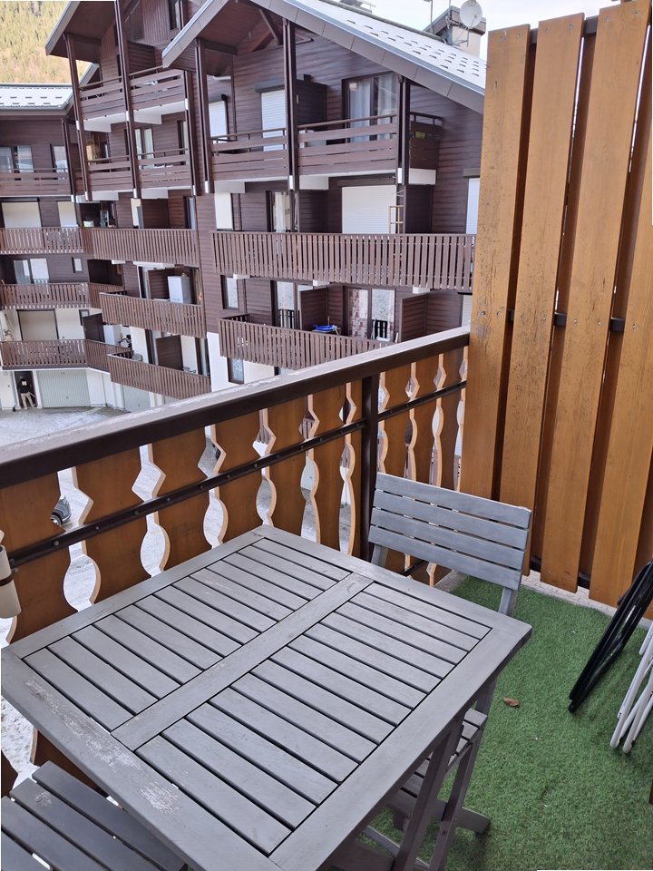 Cette pièce de vie donne sur un balcon, avec une table de jardin et 2 chaises