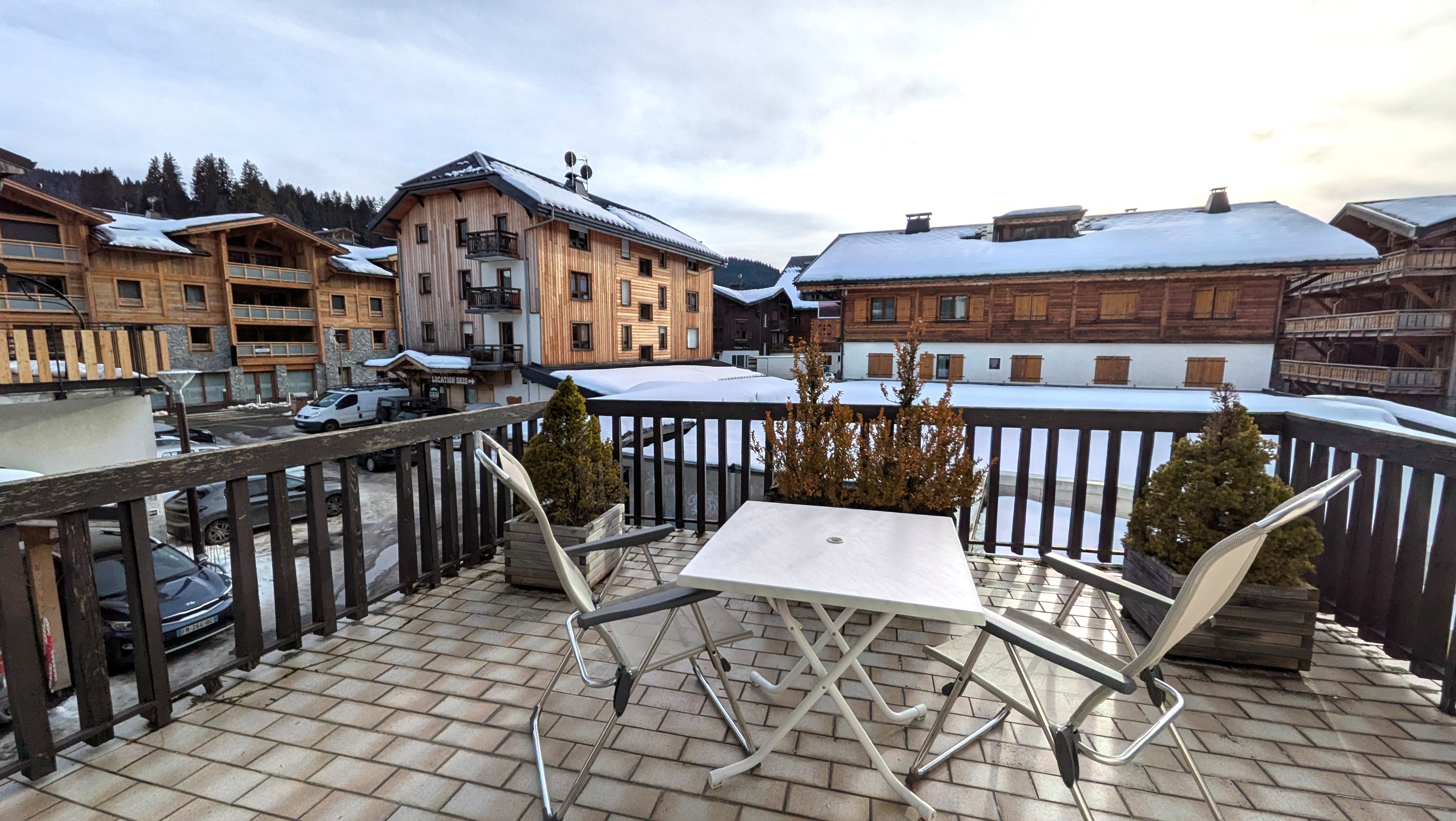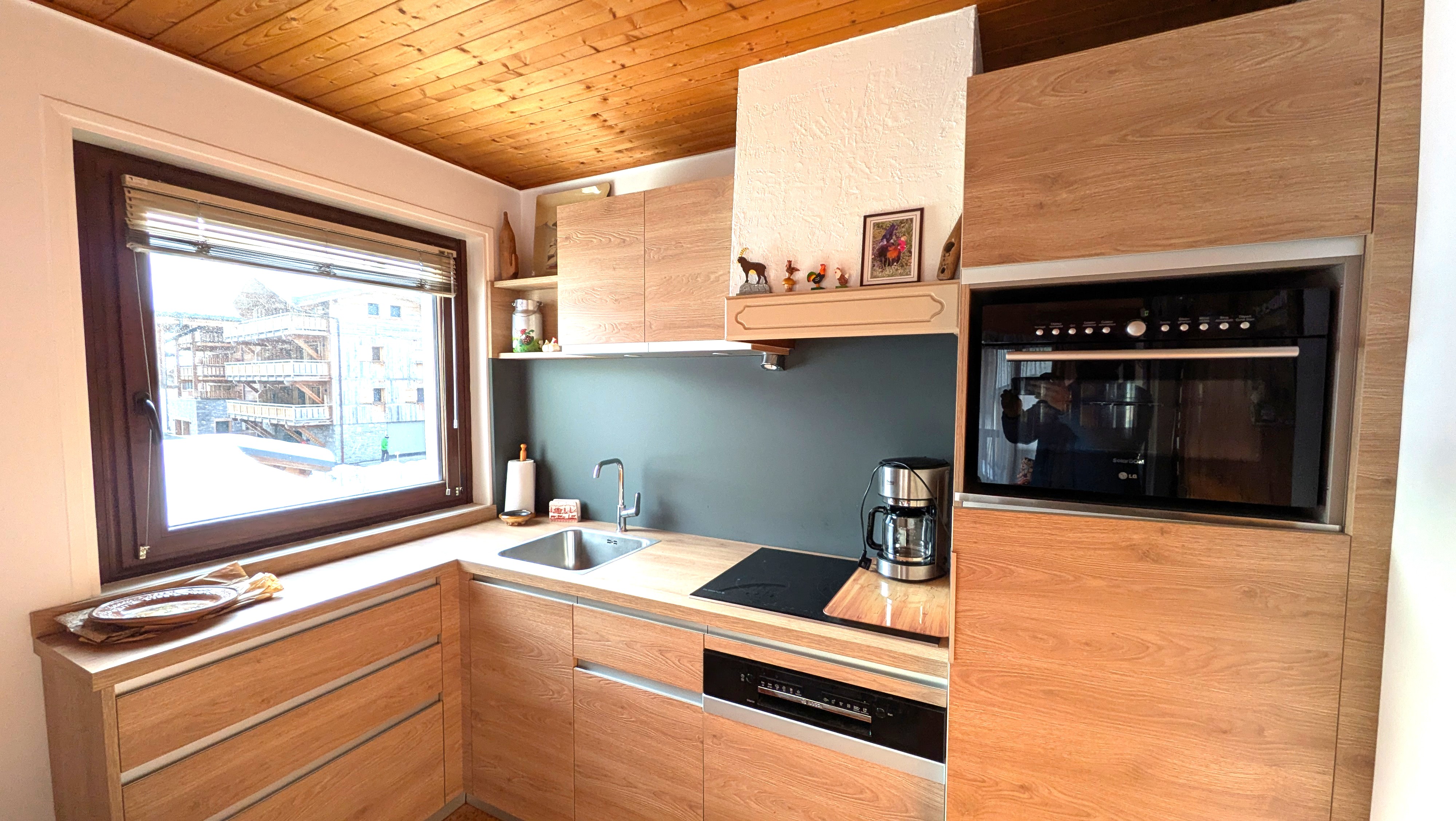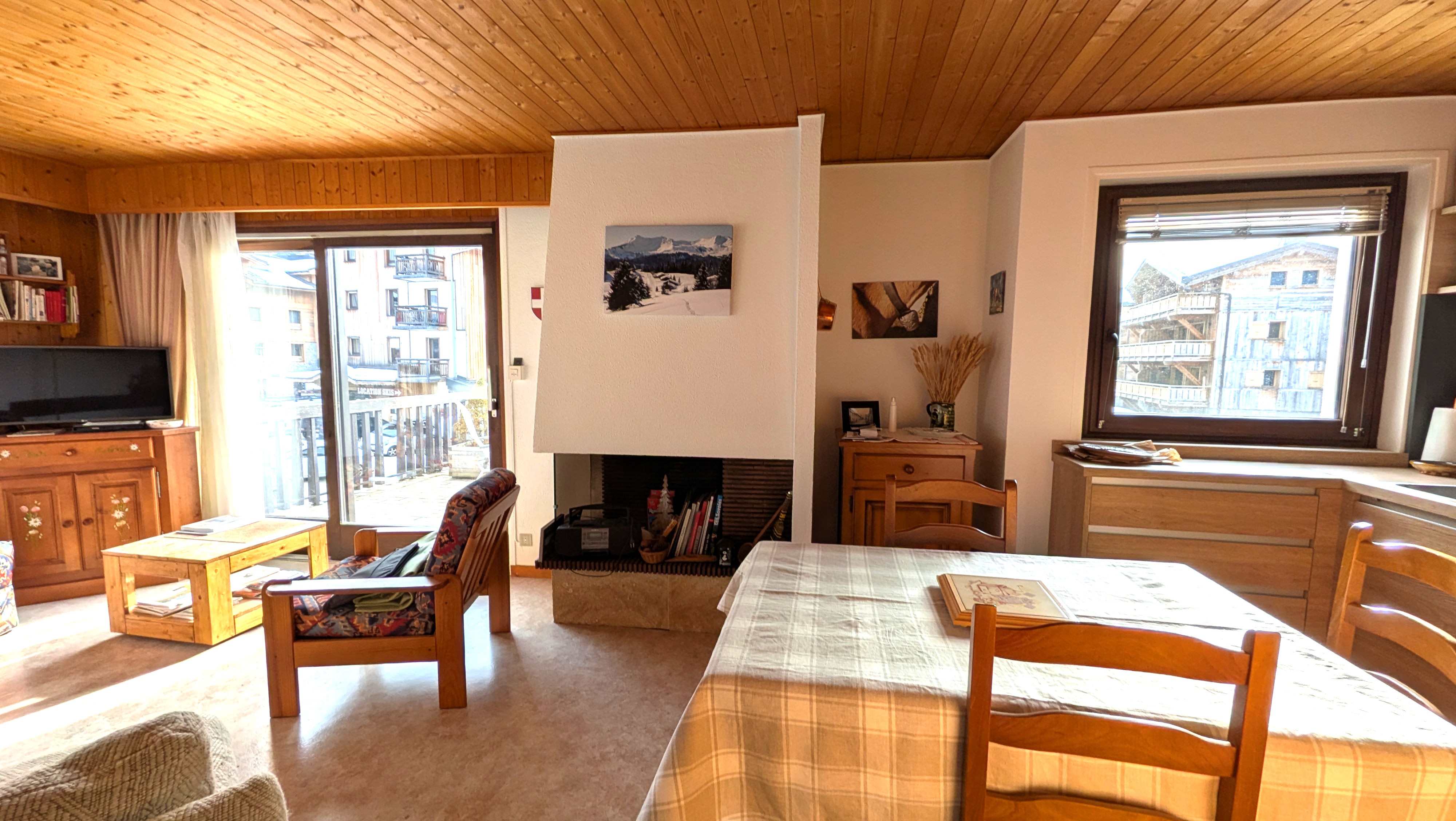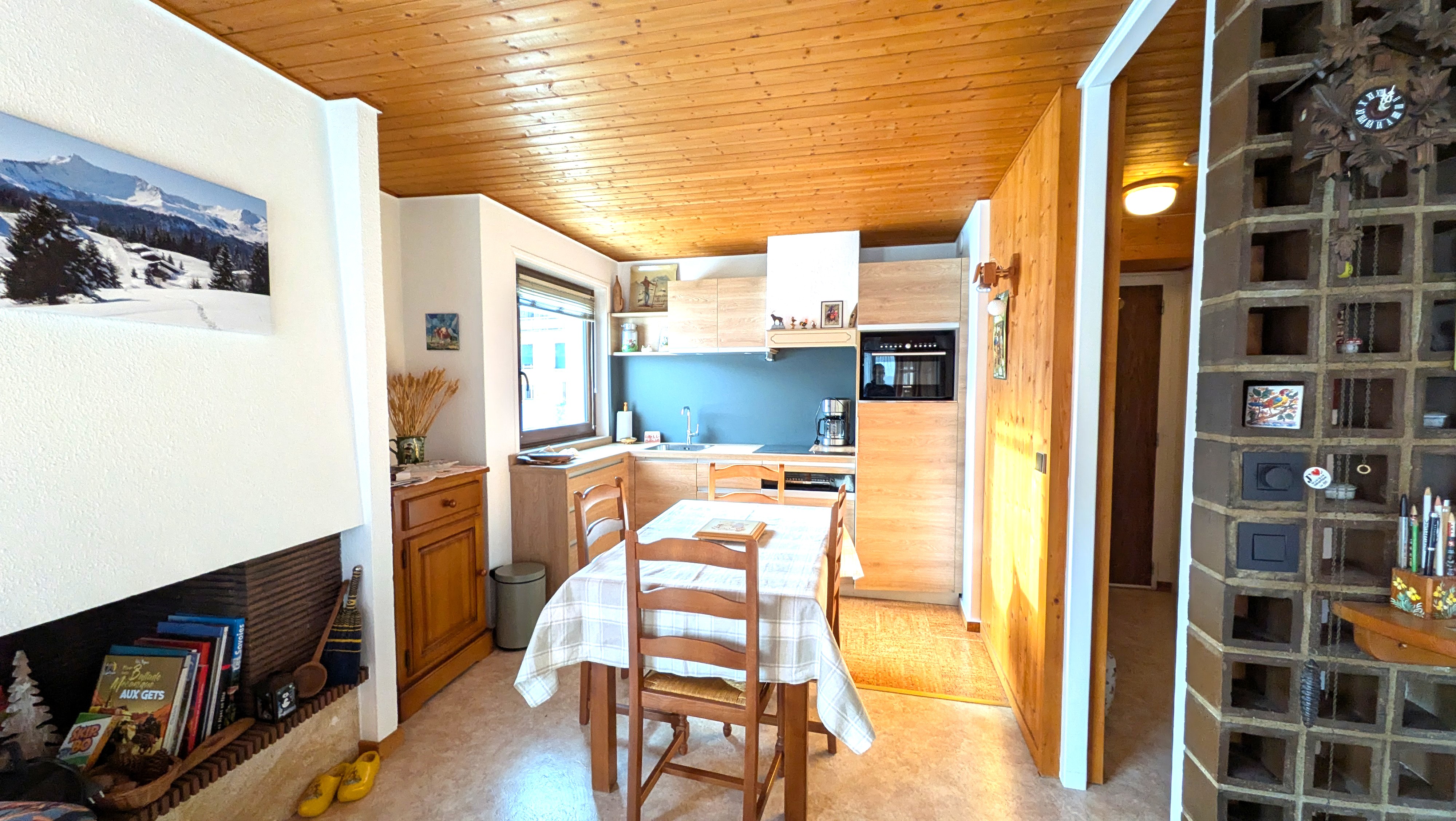 A suivre la pièce de vie avec sa jolie cuisine équipée ouverte sur le séjour et le coin détente toute cette pièce donne sur un balcon terrasse en rez de jardin avec vue sur la montagne et station.